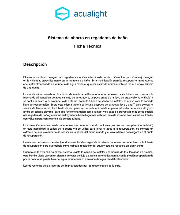 En toda vivienda vertical, se tiene un medidor general y además un medidor por vivienda, cuando se cobra el agua de áreas comunes y se checa cuanto gasto el condominio en áreas comunes, el balance de gasto de agua se vuelve a favor del condominio; normalmente se tiene que pagar prorrateando a los propietarios el gasto general (riego, agua de limpieza, agua para lavado de autos etc.). Con el sistema acualight, como se ahorra agua, el balance sale a favor del edificio y ahí es donde se ahorra el agua.